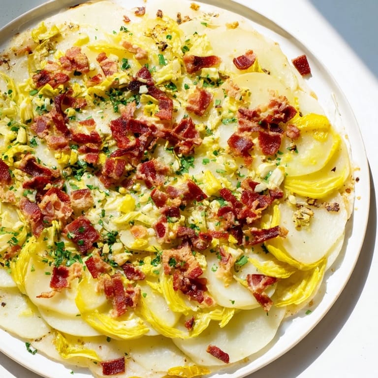 Merken Ein gemütliches, rustikales, von Deutschland inspiriertes Gericht mit zarten Kartoffeln, süßen Lauch und rauchigem Speck, das zusammen in einer cremigen, mit Kräutern verfeinerten Sauce gebacken wird. Perfekt für ein einfaches Abendessen unter der Woche oder als herzhafte Beilage.