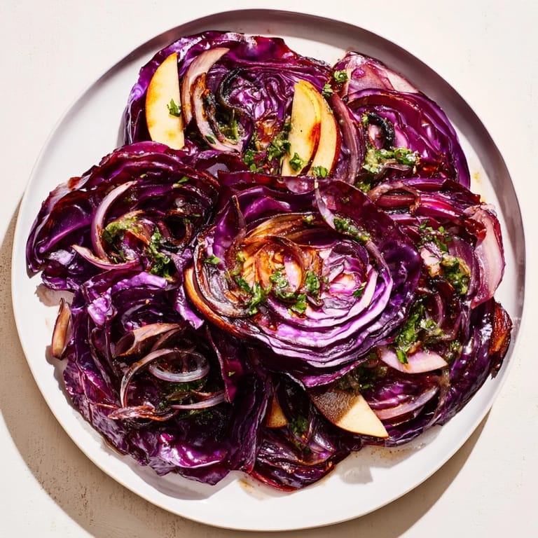 Merken Ein lebhaftes, aromatisches gebackenes Rotkohlgericht, geschichtet mit wärmenden Gewürzen und garniert mit einer würzigen, kräuterreichen Salsa Verde. Perfekt als festliche Beilage oder vegetarisches Hauptgericht.