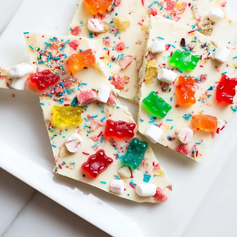 Diese bunte Köstlichkeit kombiniert zähe Gummibärchen und knackige Zuckerstangen auf einer Schicht weißer Schokolade. Die Zubereitung ist schnell und unkompliziert: geschmolzene Schokolade wird auf ein Backblech gegossen und mit den Zutaten bestreut, anschließend wird das Ganze fest. Das Ergebnis sind farbenfrohe Stücke, die ideal für Partys oder Geschenke sind. Optional sorgen Regenbogenstreusel für zusätzlichen Charme und Textur.
