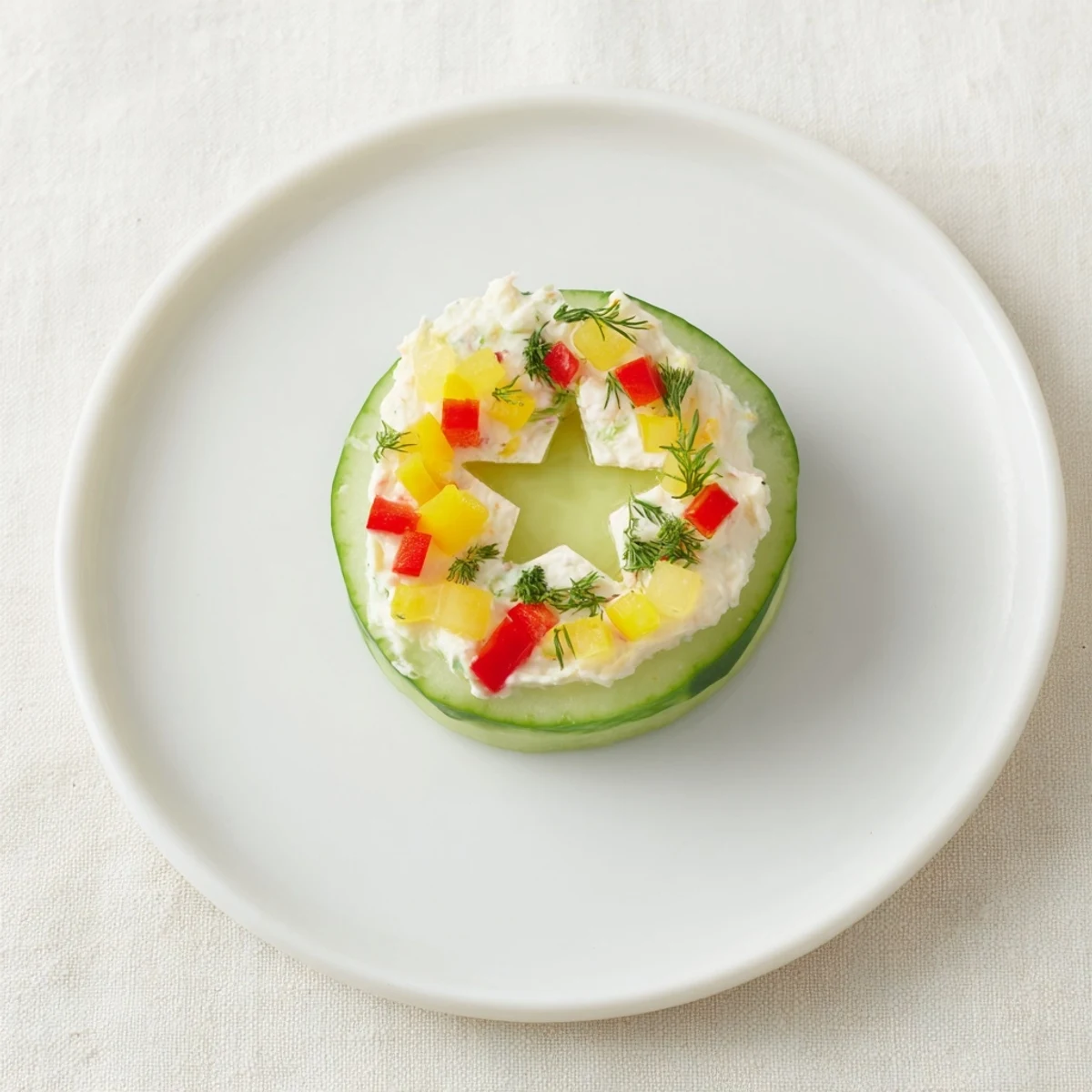 Merken Festliche, erfrischende Gurkenscheiben, belegt mit einem würzigen Frischkäseaufstrich und bunten Garnierungen, perfekt für Feiertagsfeiern.