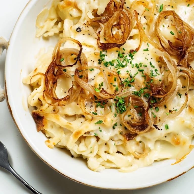 Merken Dieses herzhafte Käse-Nudelauflauf-Rezept ist ein klassisches deutsches Wohlfühlgericht, das zarte hausgemachte Spätzle-Nudeln mit geschmolzenem Käse und goldenen Zwiebeln kombiniert. Perfekt als sättigendes Hauptgericht oder als Beilage.