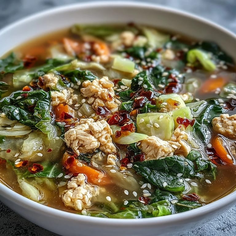 Merken One Tuesday night, I was staring at leftover cabbage and ground chicken, trying to avoid another bland stir-fry, when my neighbor mentioned she craved egg rolls but wanted something warm and comforting. That's when it clicked—why not turn everything I love about a crispy egg roll into a silky broth instead? The result was this soup, and I've been making it ever since because it hits all those savory, gingery notes without the fuss of rolling and frying.