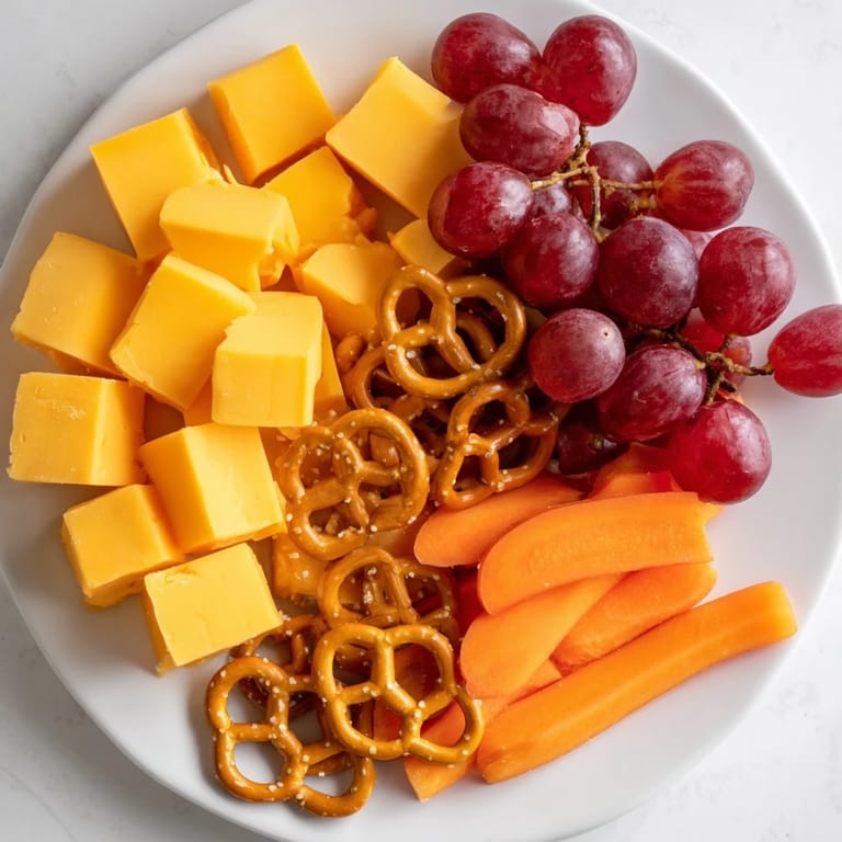- Herzhafte Snacks: 1 Tasse Babykarotten, 1 Tasse Gurkenscheiben, 1 Tasse Kirschtomaten, 1 Tasse Cheddarkäsewürfel, 1 Tasse Puten- oder Hähnchenscheiben (optional Austausch gegen mehr Gemüse oder pflanzliche Aufschnittscheiben für Vegetarier), 1 Tasse Mini-Brezeln, 1 Tasse Mehrkorncracker