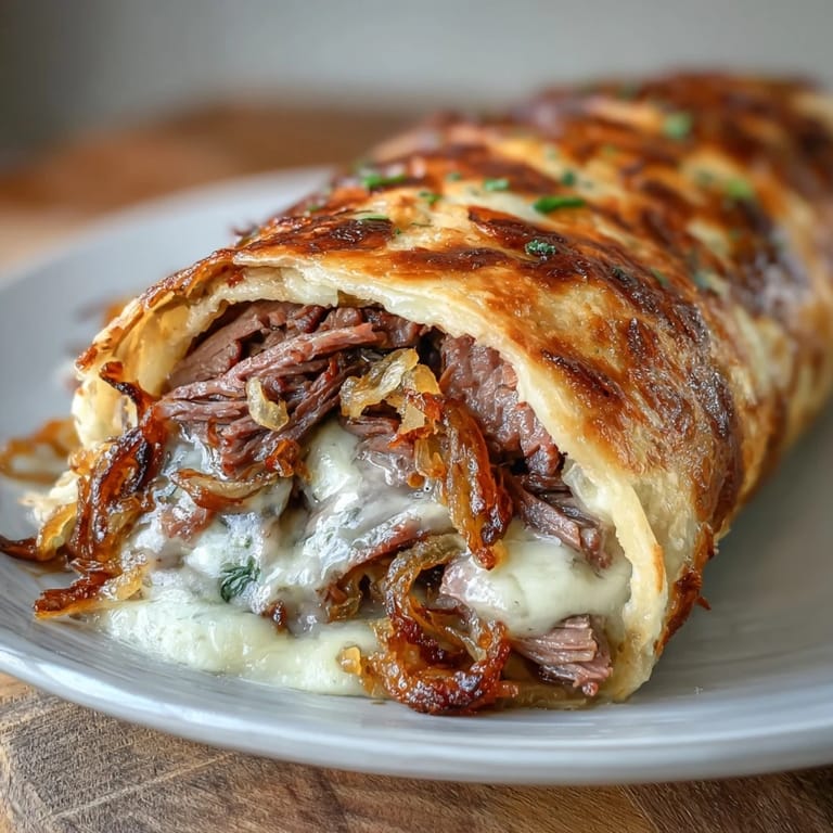 Merken Ein Freund brachte diese Wickel zu einem Potluck mit, und ich war sofort fasziniert—das war wie ein französisches Dip-Sandwich, das jemand mit Liebe und knusprigen Tortillas neu erfunden hatte. Die ersten Bisse waren ein Schock der Texturen: weiches Rindfleisch, geschmolzener Käse und dann diese wunderbar knusprigen gebratenen Zwiebeln, die alles zusammenhielten. Ich musste das Rezept sofort bekommen und habe es später an einem regnerischen Mittwochabend ausprobiert, als ich einfach etwas Tröstliches brauchte, das auch elegant genug für Gäste war. Seitdem haben diese Roll-ups meinen Appetizer-Rotation dominiert.