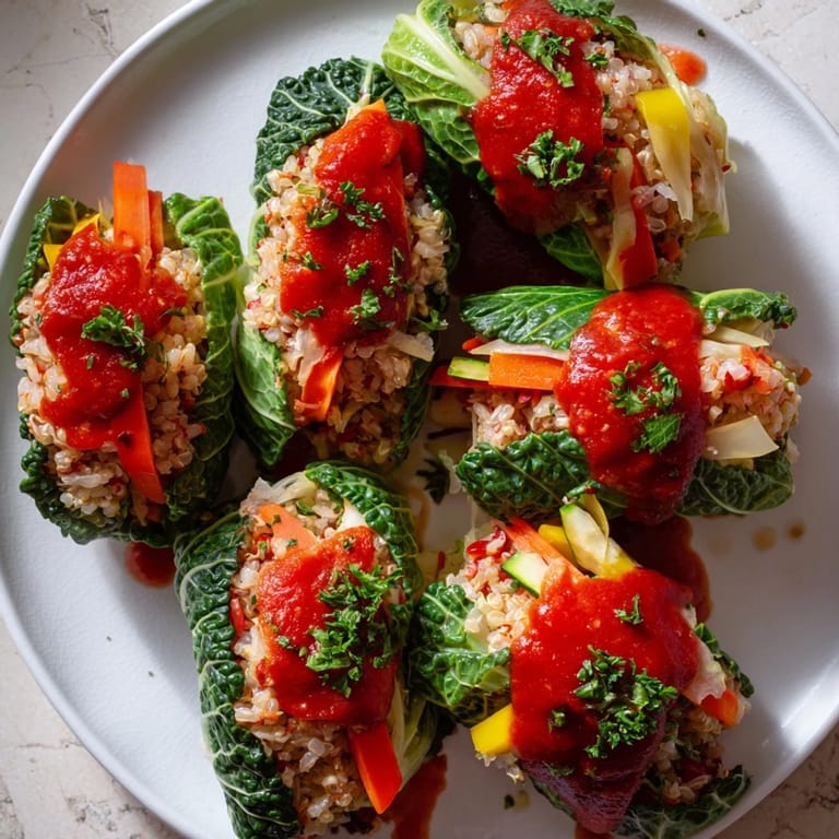Merken Bunte, würzige Sauerkraut und lebendige Gemüsesorten, eingewickelt in zarte Kohlblätter, schaffen ein köstliches und auffälliges vegetarisches Gericht.