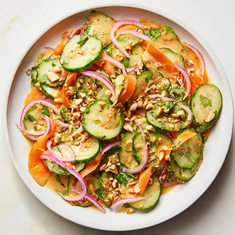 Merken Es war an einem heißen Sommernachmittag, als meine Nachbarin über den Gartenzaun lehnte und mir von diesem Salat erzählte, den sie auf einer Reise nach Bangkok entdeckt hatte. Sie beschrieb die cremige Erdnusssauce so lebendig, dass ich sofort in die Küche eilte und es ausprobieren musste. Das erste Mal, als ich die Gurken mit dieser samtigen Mischung vermischte, verstand ich sofort, warum sie nicht aufgehört hatte, davon zu schwärmen. Jetzt mache ich ihn ständig, wenn ich etwas Erfrischendes und gleichzeitig Befriedigendes brauche.