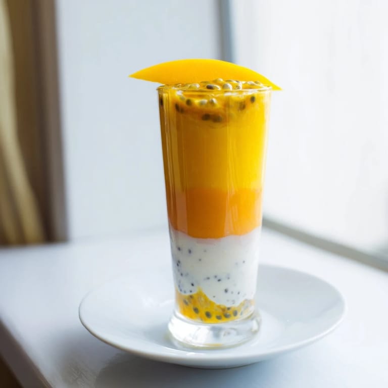 - Ein dünner Mangoscheibe oder ein Minzblatt oben drauf macht es perfekt, und der Trick ist zu servieren, sobald die Schichten sichtbar sind – je länger du wartest, desto mehr vermischen sie sich sanft miteinander.